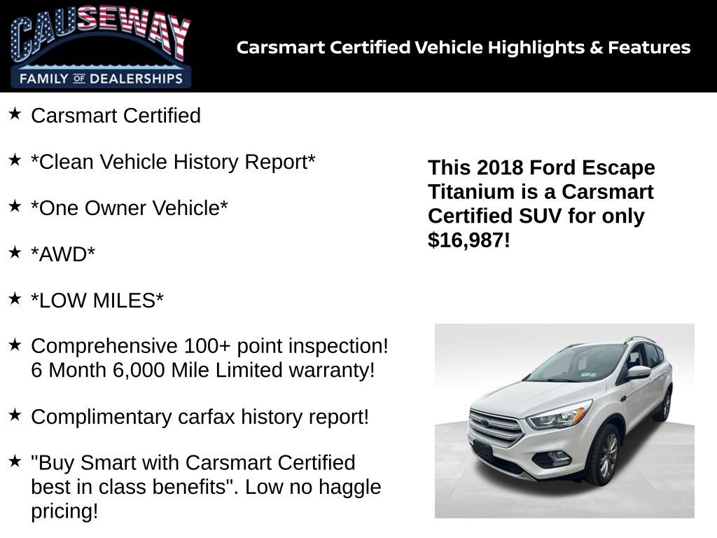 The 2018 Ford Escape Titanium blends luxury, advanced tech, and rugged performance in one certified package. With low miles, AWD capability, and Carsmart Certified protection, this Escape is the smart SUV choice for drivers who want it all.