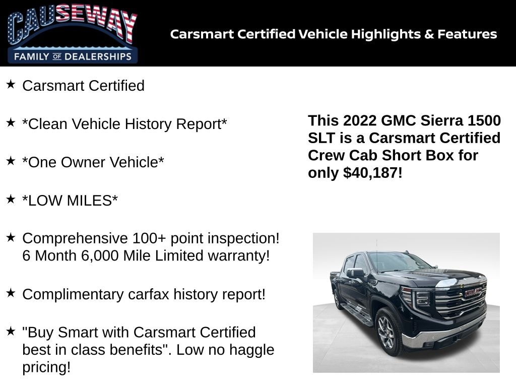 Drive with confidence in the 2022 GMC Sierra 1500 SLT finished in commanding Onyx Black. This Carsmart Certified 4WD truck combines robust performance, premium comfort, and low-mileage assurance, making it a smart choice for work, play, or daily driving. With a Clean Vehicle History Report, One Owner Vehicle status, and Comprehensive 100+ Point Inspection, you get peace of mind with every mile.