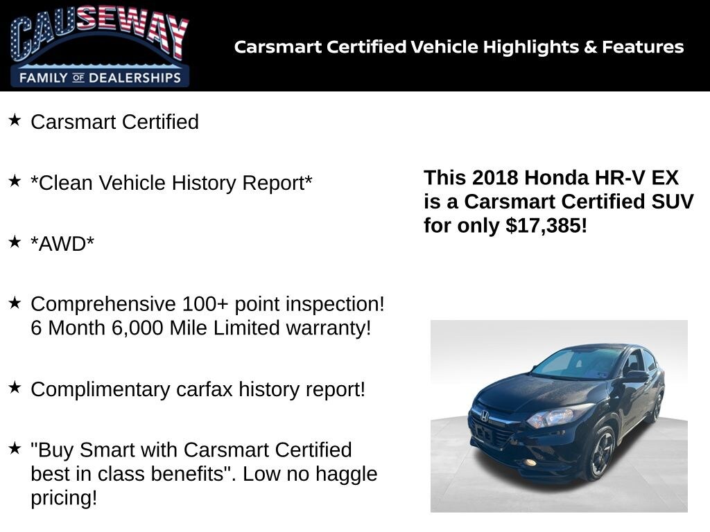 This HR-V EX delivers the sweet spot of practicality and style: confident AWD, a fuel-friendly 1.8L i-VTEC, and Hondas hallmark reliabilitynow Carsmart Certified with a Clean Vehicle History Report and a Comprehensive 100+ Point Inspection. With mileage 7,963 below market average and an EPA-rated 27/31 City/Highway MPG, its the smart, efficient crossover for commuters, first-time buyers, and weekend explorers alike.