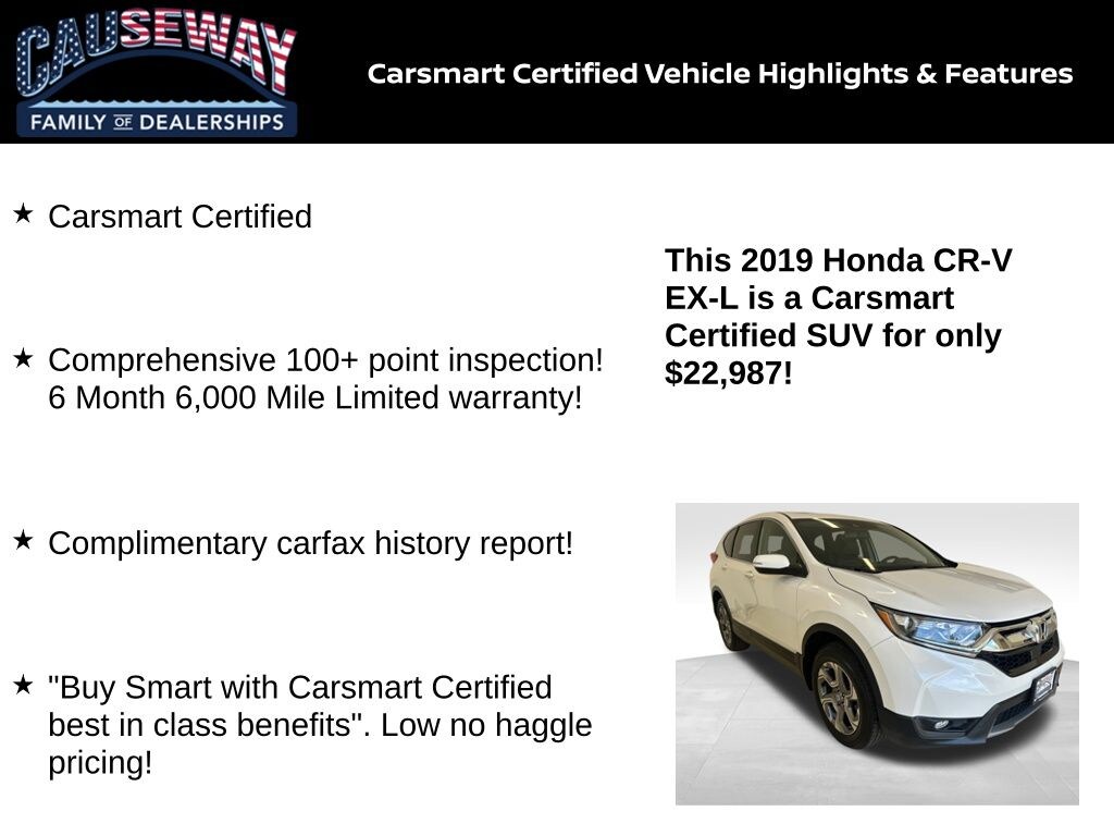 Elevate your driving experience with the 2019 Honda CR-V EX-L in Platinum White Pearl, featuring a refined leather interior and advanced all-wheel-drive capability. This Carsmart Certified vehicle has undergone a comprehensive 100+ point inspection and comes with a 6-month/6,000-mile limited warranty and a complimentary Carfax history report, giving you complete peace of mind.