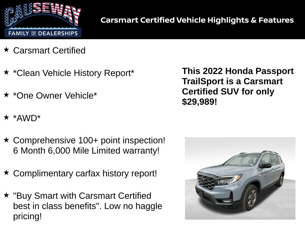 Go farther in comfort and confidence with this rugged Passport TrailSportthe sweet spot between daily-driver manners and weekend capability. Backed by our Carsmart Certified program and a Clean Vehicle History Report, its the no-hassle SUV thats ready now.