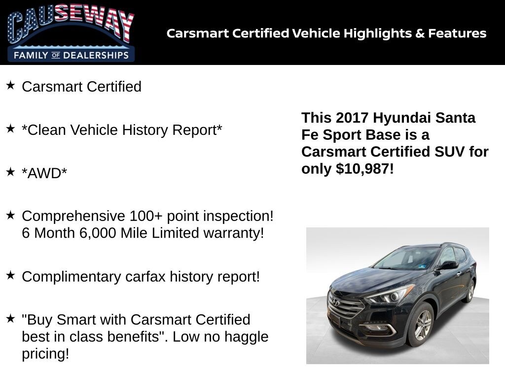 Drive with confidence in this Carsmart Certified 2017 Hyundai Santa Fe Sport 2.4 AWD, finished in sleek Twilight Black with a refined Beige interior. Backed by a Clean Vehicle History Report, a comprehensive 100+ point inspection, and a 6-month/6,000-mile limited warranty, this SUV offers peace of mind and best-in-class Carsmart Certified benefitsincluding a complimentary Carfax history report and low, no-haggle pricing.