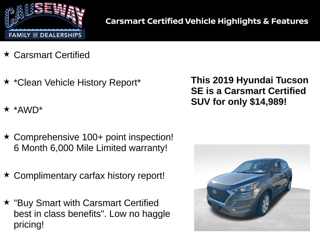 Recent Arrival! This 2019 Hyundai Tucson SE AWD blends everyday comfort, modern tech, and all-weather capabilitybacked by Carsmart Certified benefits and low, no-haggle pricing.