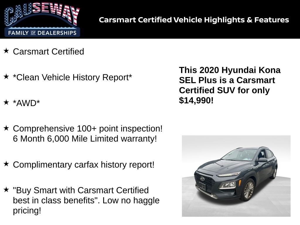 Stand out on the road in this Thunder Gray 2020 Hyundai Kona SEL Plus AWD, a versatile crossover designed to balance style, technology, and confidence. Backed by Carsmart Certification, this SUV has undergone a comprehensive 100+ point inspection and comes with a 6 Month/6,000 Mile Limited Warranty for added peace of mind.
