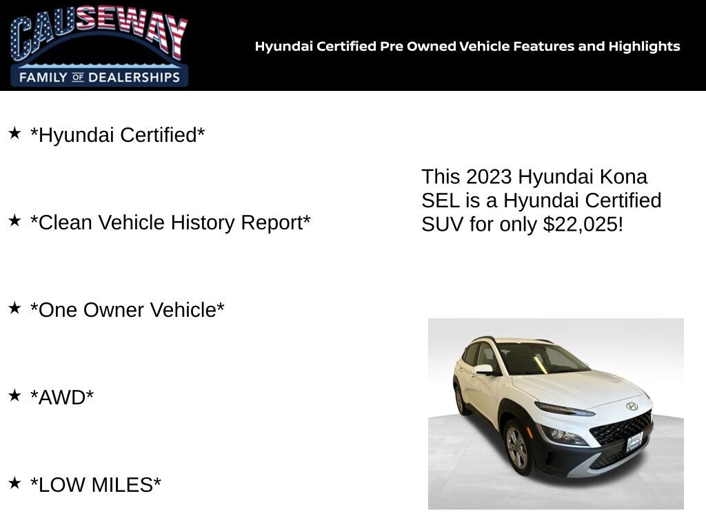 The 2023 Hyundai Kona SEL delivers premium features, dependable AWD performance, and exceptional Certified Pre-Owned benefitsall wrapped in a sleek, modern package.