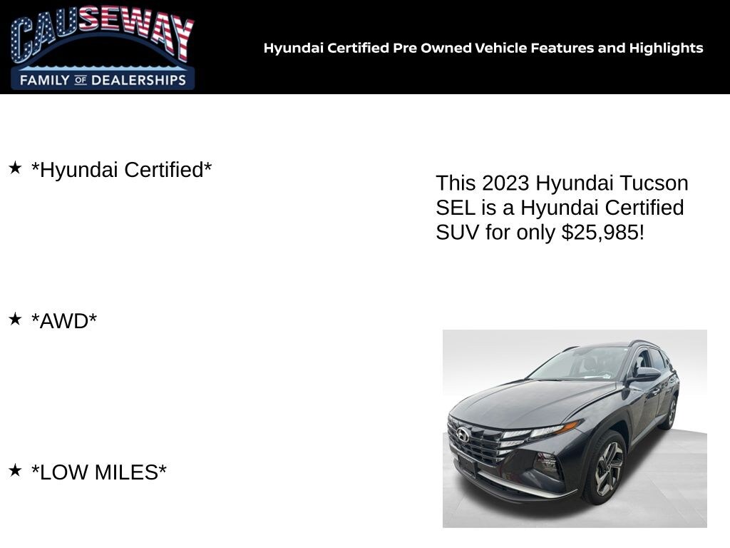 Drive smarter with this Hyundai Certified 2023 Tucson SEL AWD, finished in sleek Portofino Gray with a refined Black interior. With low miles, manufacturer-backed warranty protection, and an advanced suite of features, this SUV delivers everyday practicality with upscale comfort.
