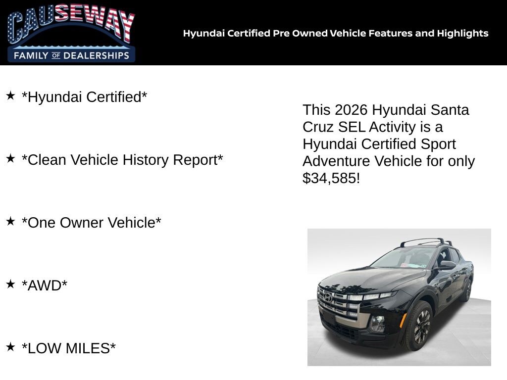 Redefine versatility with this 2026 Hyundai Santa Cruz SEL, a bold blend of SUV comfort and pickup truck utility. Finished in Phantom Black and backed by Hyundai Certified benefits, this one-owner, low-mileage AWD delivers both rugged capability and refined daily driving. With just 905 miles, its practically brand new and ready for anything.