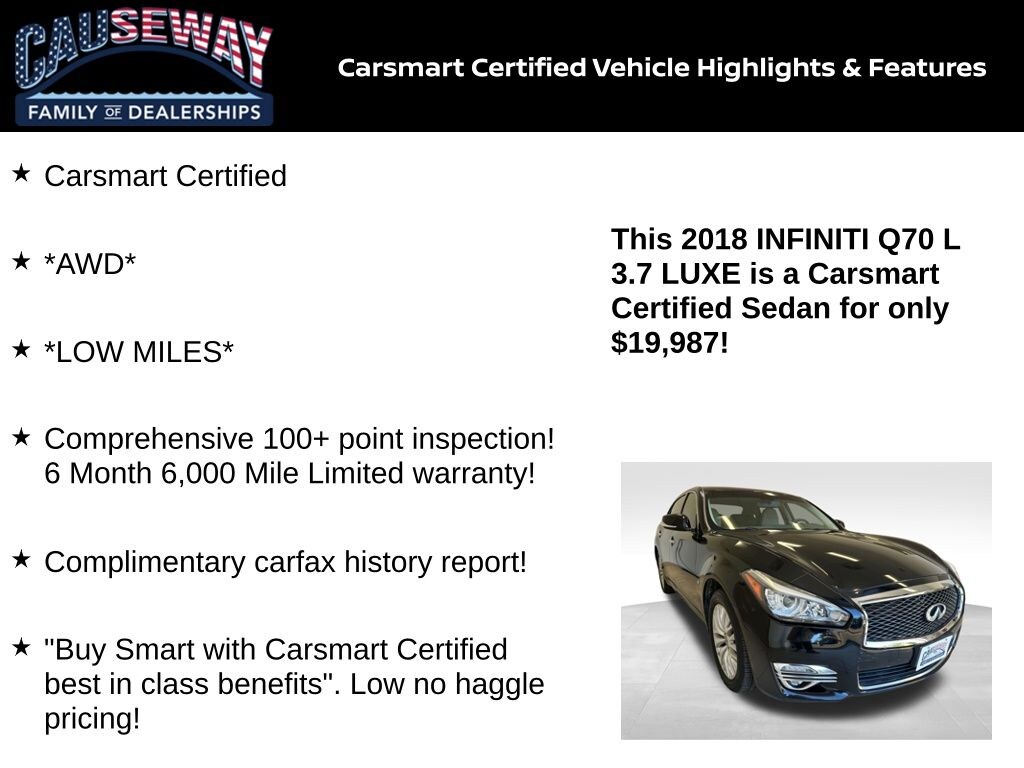 With LOW MILES and Carsmart Certified coverage, this Q70L is a rare opportunity to own a flagship luxury sedan at incredible value.