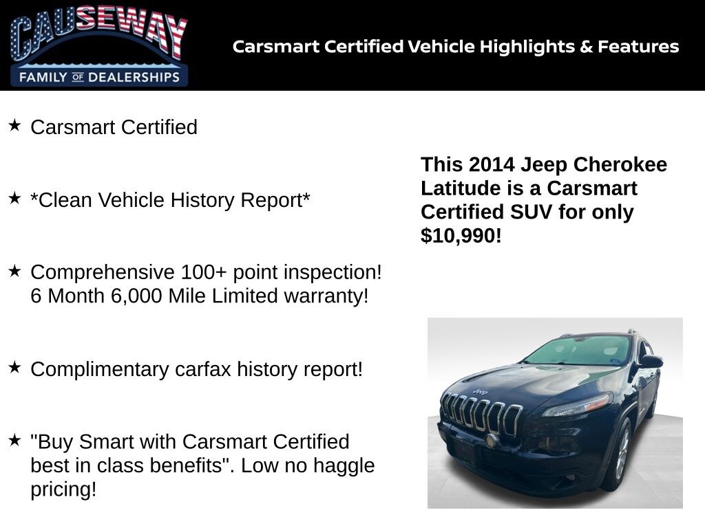 Experience the perfect blend of adventure and refinement in this 2014 Jeep Cherokee Latitude 4WD, finished in bold True Blue Pearlcoat. With its powerful 3.2L V6 engine, versatile 4-wheel-drive system, and refined interior, this SUV delivers both performance and practicality. Backed by the Carsmart Certified program, youll enjoy peace of mind with warranty protection, a detailed inspection, and a complimentary Carfax report.