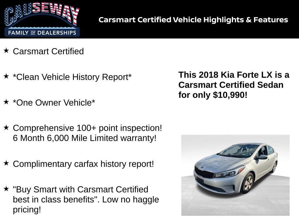 Economical, reliable, and easy to ownthe 2018 Kia Forte LX delivers outstanding value with excellent fuel efficiency, modern features, and a comfortable drive. Finished in Silky Silver, this Forte comes with a Clean Vehicle History Report, One Owner status, and full Carsmart Certified protection.