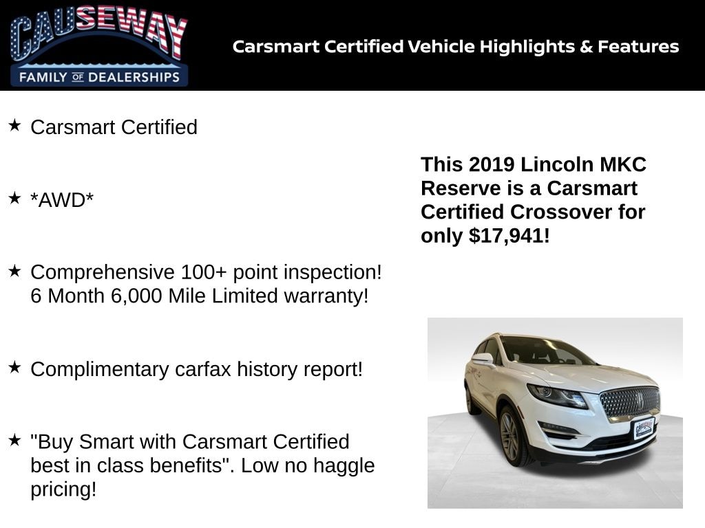 Experience premium comfort, advanced technology, and all-weather confidence in this 2019 Lincoln MKC Reserve, finished in elegant White Platinum and equipped with AWD for year-round driving assurance. This MKC has been Carsmart Certified, meaning it has passed a comprehensive 100+ point inspection and includes added protection and value that make it an outstanding choice in the luxury compact SUV segment.
