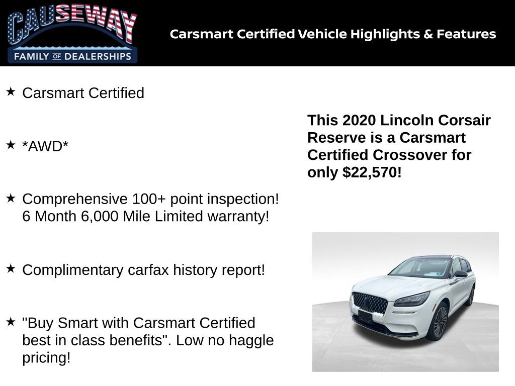 Elevate every mile in the Corsair ReserveLincolns refined 2-row luxury SUV that wraps you in quiet serenity, confident performance, and first-class technology. Dressed in timeless White and powered by a smooth 2.0L I4 paired to an 8-Speed Automatic, this AWD Corsair delivers poised acceleration, excellent road manners, and impressive efficiency.