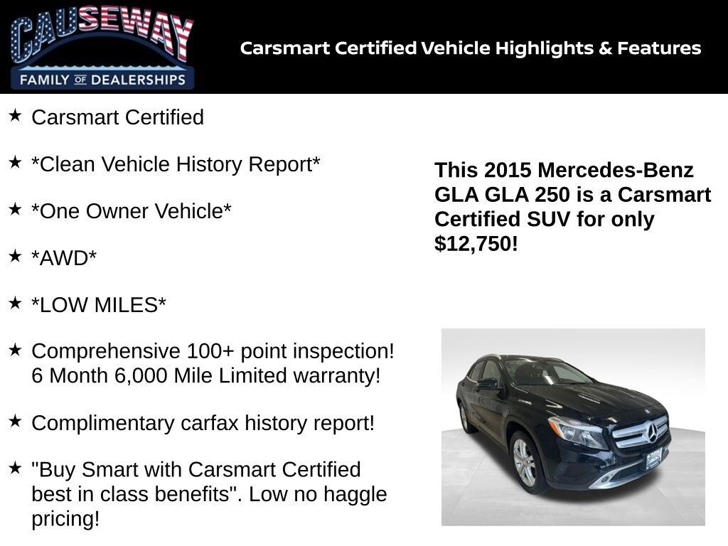 Experience the perfect blend of sophisticated style, agile performance, and Mercedes-Benz engineering with the 2015 GLA 250 4MATIC. This Carsmart Certified, one-owner, low-mileage SUV delivers confidence, comfort, and reliabilityall backed by a Comprehensive 100+ point inspection and a 6 Month / 6,000 Mile Limited Warranty. With its 4MATIC all-wheel-drive system, youll enjoy exceptional handling and control in every driving condition.