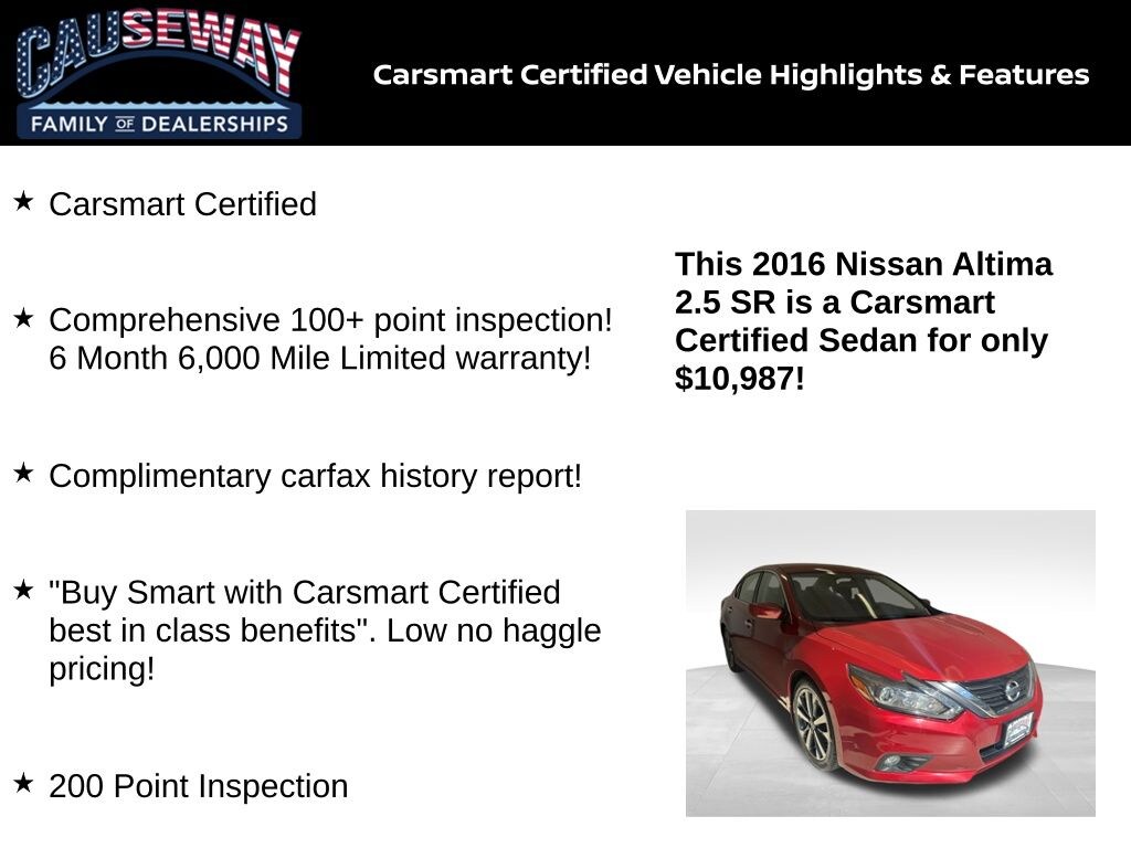 This 2016 Nissan Altima 2.5 SR combines sporty style, comfort, and certified reliability in a sedan thats perfect for commuting, weekend drives, or daily adventures. With low miles, one-owner history, and Carsmart certification, its ready to provide a fun, efficient, and worry-free driving experience.