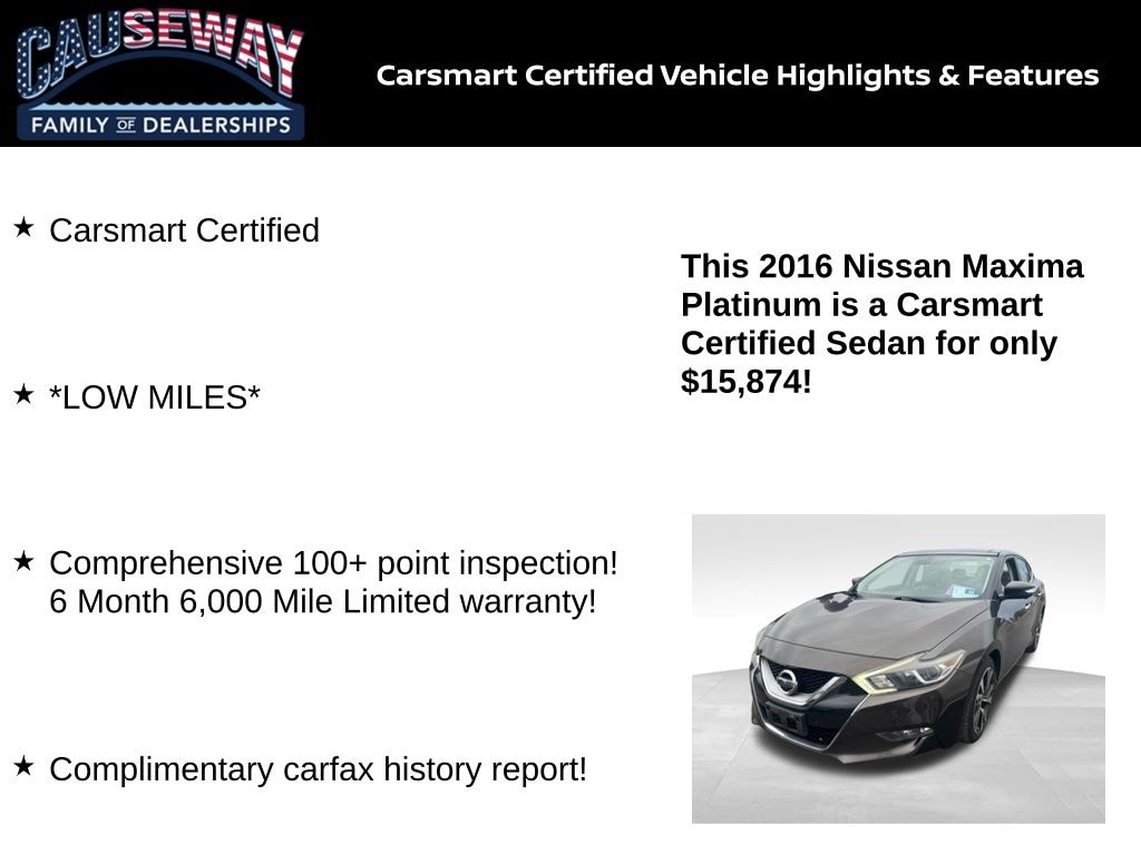 Meet the flagship of Nissan sedansthis 2016 Nissan Maxima Platinum, finished in rare and elegant Forged Bronze, blends premium luxury with exhilarating V6 performance. With LOW MILES, a full Carsmart Certified 100+ point inspection, and a 6 Month/6,000 Mile Limited Warranty, this Maxima delivers outstanding value and long-term confidence.
