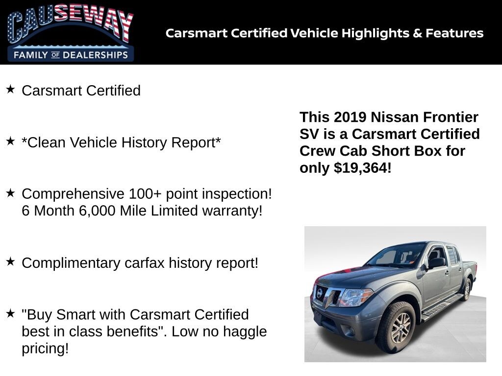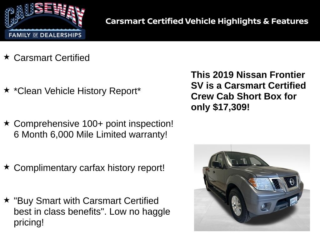 Rugged, reliable, and ready for work or adventurethis 2019 Nissan Frontier SV 4WD in Gun Metallic delivers classic pickup durability with modern capability. Backed by a Clean Vehicle History Report, full Carsmart Certified benefits, and a thorough 100+ point inspection, this Frontier is built to go the distance.