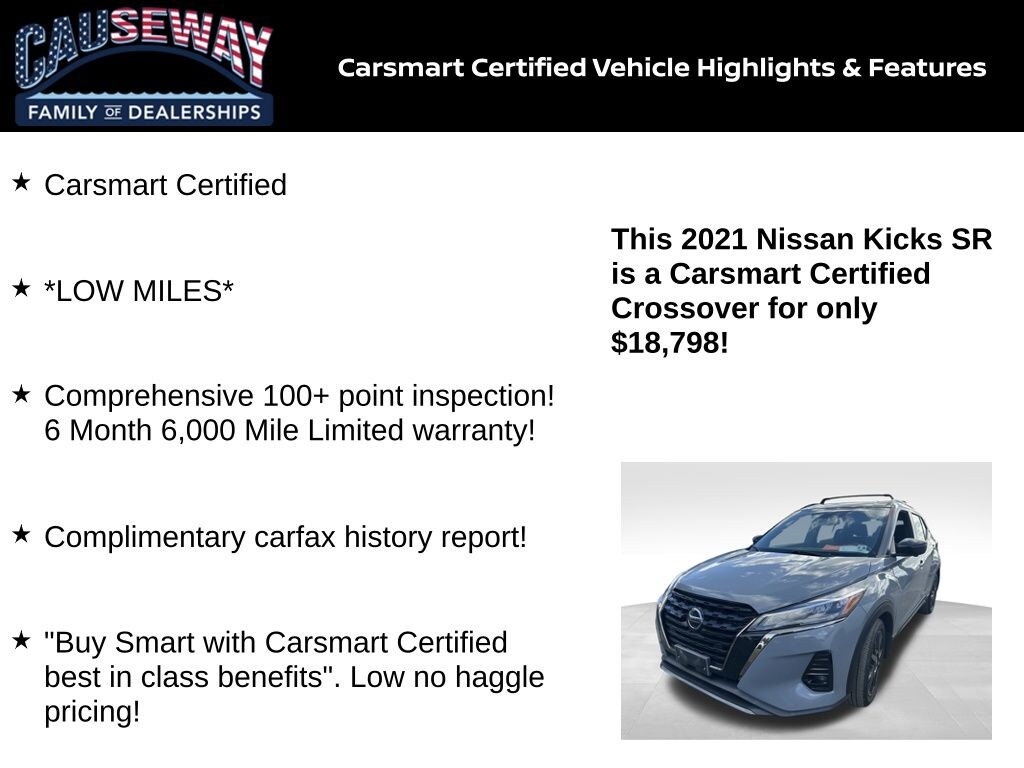 Step into the 2021 Nissan Kicks SR in Boulder Gray Pearl, a compact SUV that blends urban style, efficiency, and advanced technology. This Carsmart Certified vehicle comes with a comprehensive 100+ point inspection, 6-month/6,000-mile limited warranty, and a complimentary Carfax history report, providing peace of mind along with a low-mileage ride at 35,225 miles.