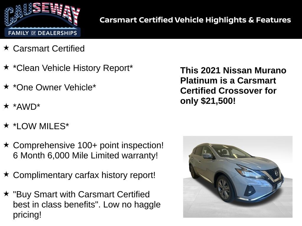 Command the road with sophistication in this 2021 Nissan Murano Platinum AWD, finished in the sleek Boulder Gray Pearl with a refined Graphite Leather interior. Designed for drivers who demand comfort, capability, and class, this Murano Platinum delivers premium features, advanced technology, and powerful performanceall with the confidence of Carsmart Certified benefits.