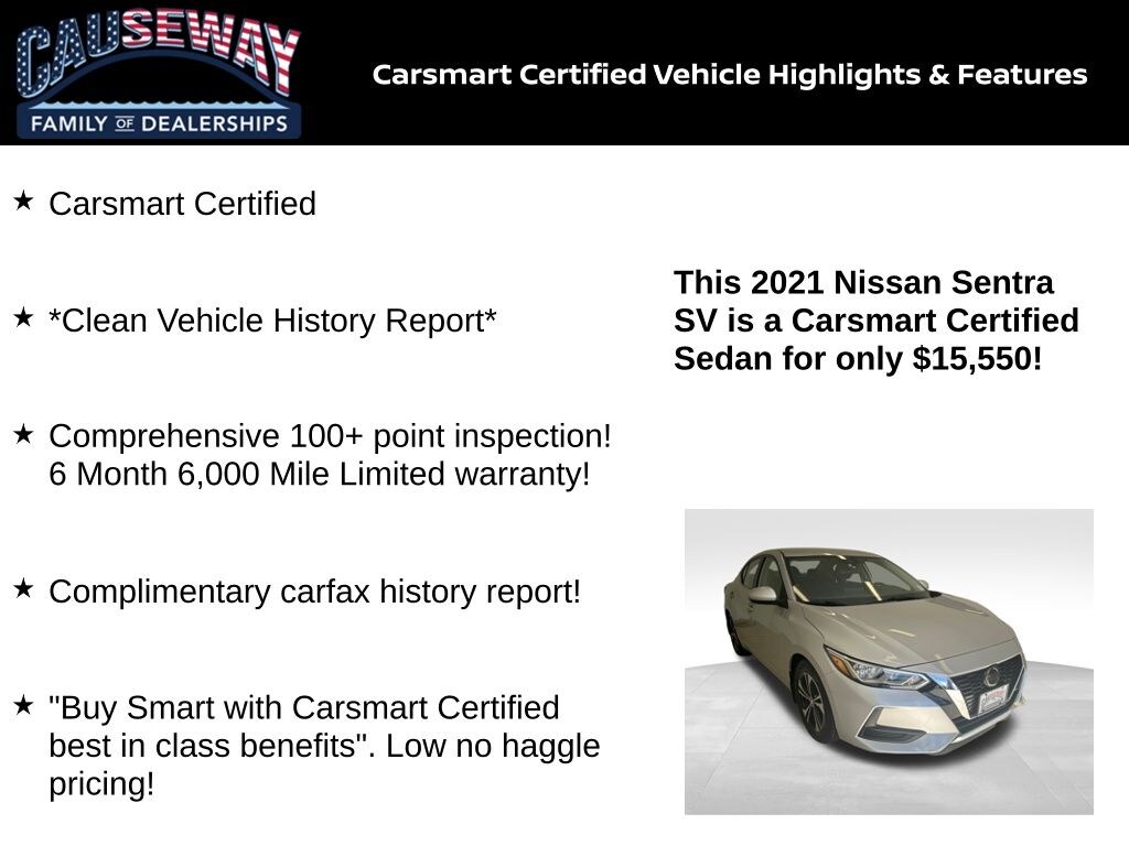The 2021 Nissan Sentra SV stands out as a stylish, efficient, and feature-rich sedan that offers far more than basic transportation. With its Carsmart Certified warranty, clean history, and low-hassle pricing, this Sentra delivers unbeatable value along with the comfort and peace of mind you deserve.