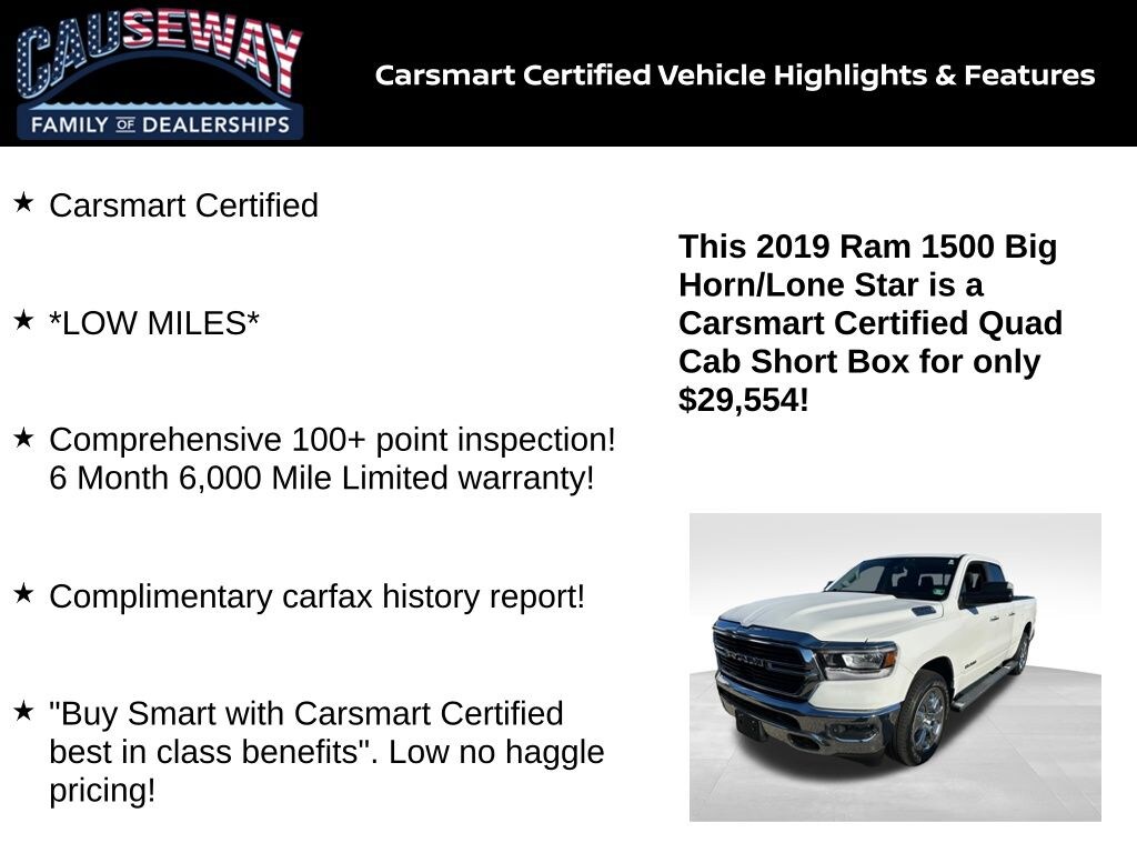 Turn every job into a joyride with Americas favorite work-hard/play-hard half-ton. This 2019 Ram 1500 Big Horn/Lone Star 4Ã4 pairs the legendary HEMI 5.7L V8 with a quick-shifting 8-speed automatic, delivering the muscle, comfort, and tech that make it a standout on the lot and on the road.
