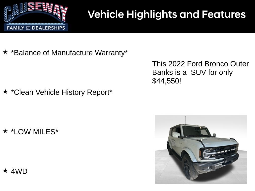 The 2022 Ford Bronco Outer Banks 4WD is more than just an SUVits a lifestyle vehicle designed to handle daily driving and weekend adventures with equal confidence. If youre ready to experience iconic capability wrapped in modern comfort, this Bronco is built for you.