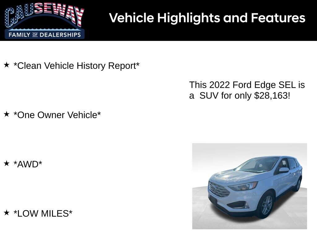 2022 Ford Edge SEL Oxford White AWD 8-Speed Automatic EcoBoost 2.0L I4 GTDi DOHC Turbocharged VCT *Clean Vehicle History Report*, *One Owner Vehicle*, *AWD*, *LOW MILES*, AWD.
