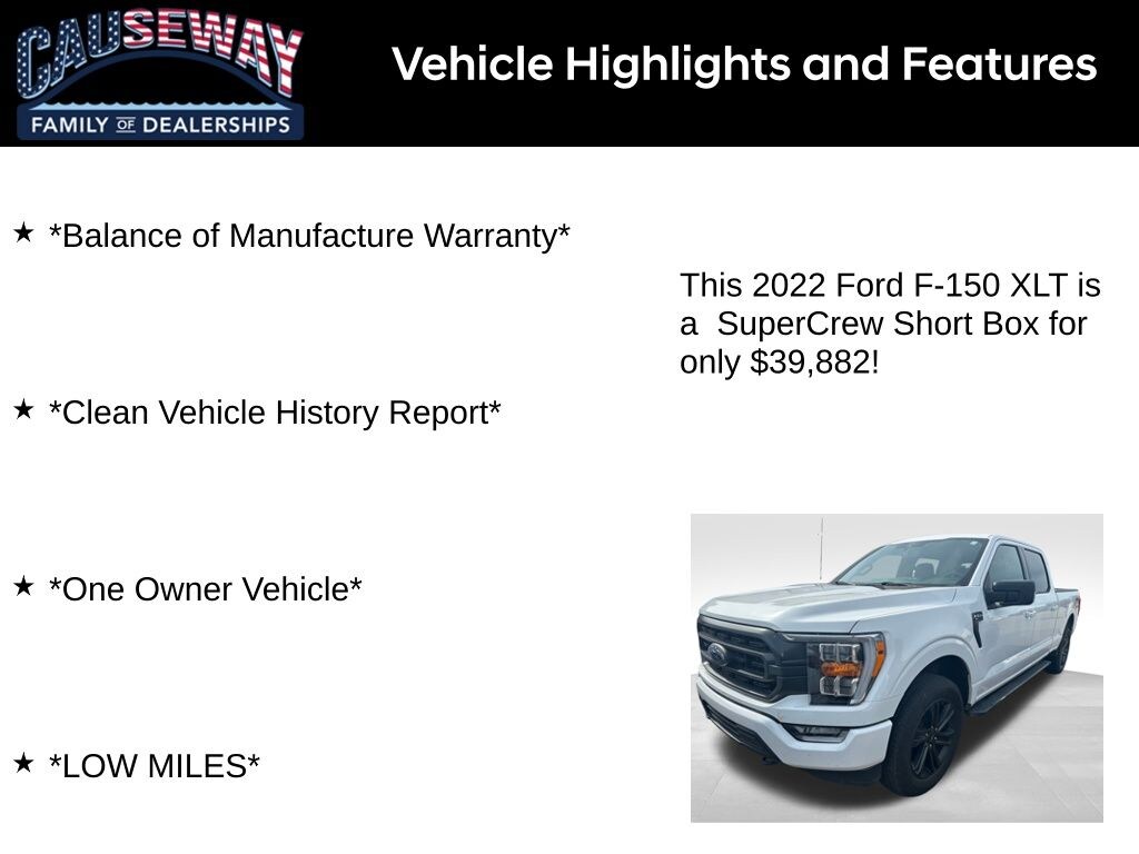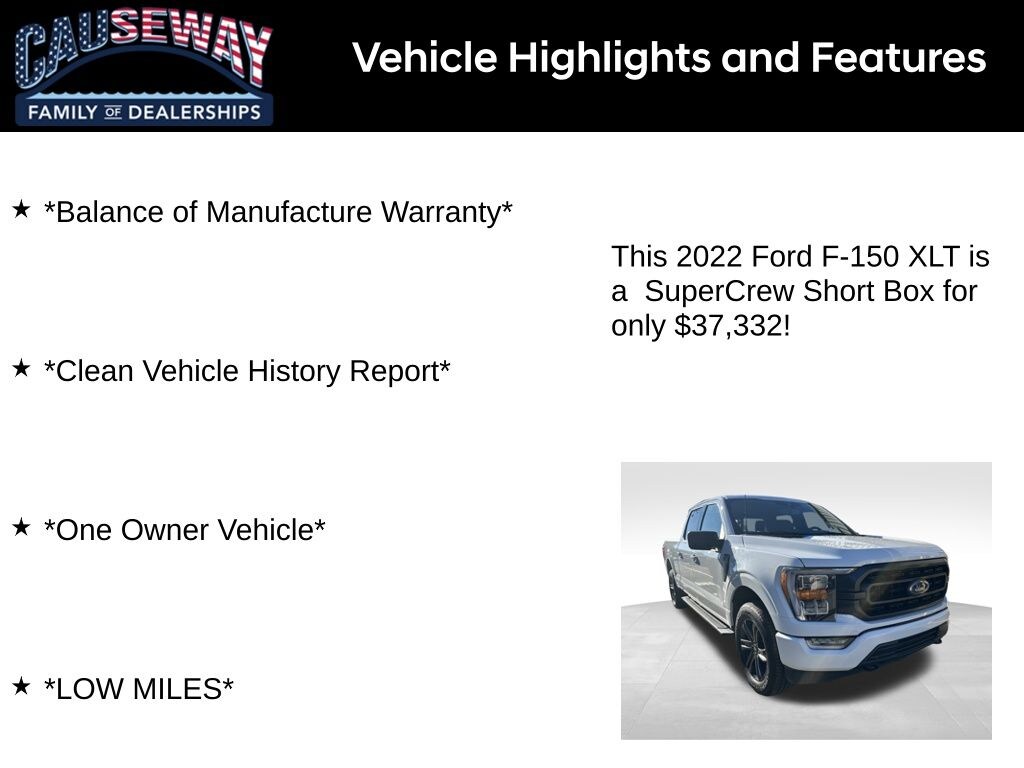 The 2022 Ford F-150 XLT is more than just a truckits a versatile, reliable, and stylish companion for work, play, and everything in between. With low miles, a clean history, and a balance of manufacturer warranty, you can drive with confidence while enjoying the power and capability only a Ford F-150 can deliver.