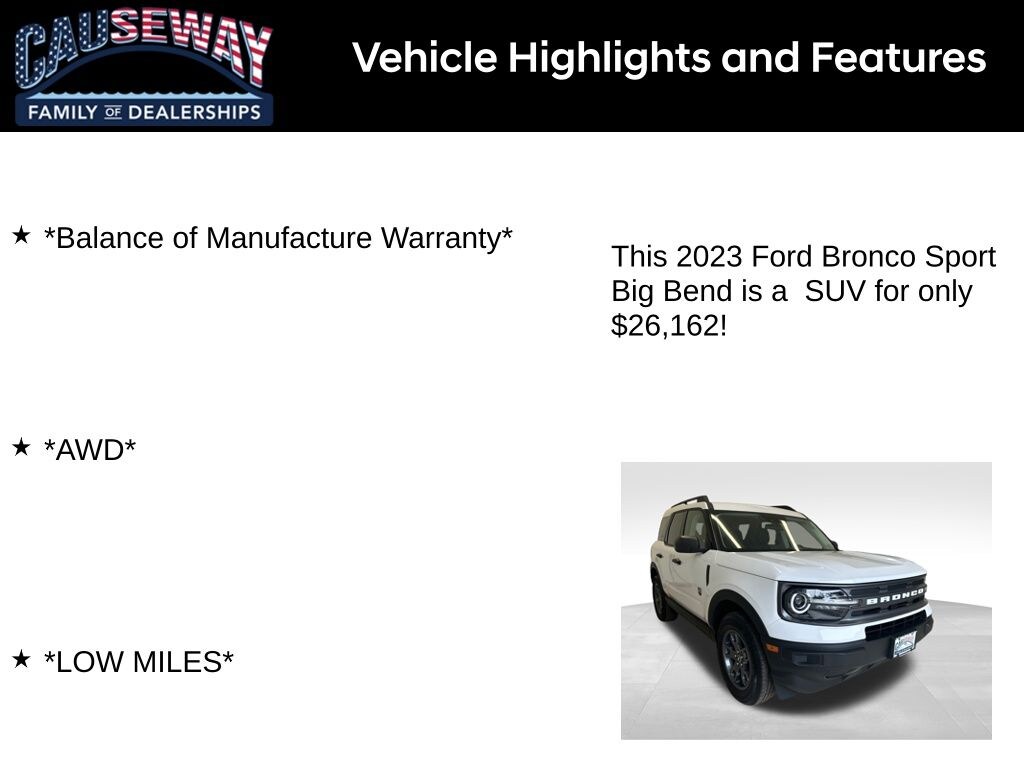 2023 Ford Bronco Sport Big Bend Oxford White 4WD 8-Speed Automatic 1.5L EcoBoost *Balance of Manufacture Warranty*, *AWD*, *LOW MILES*.