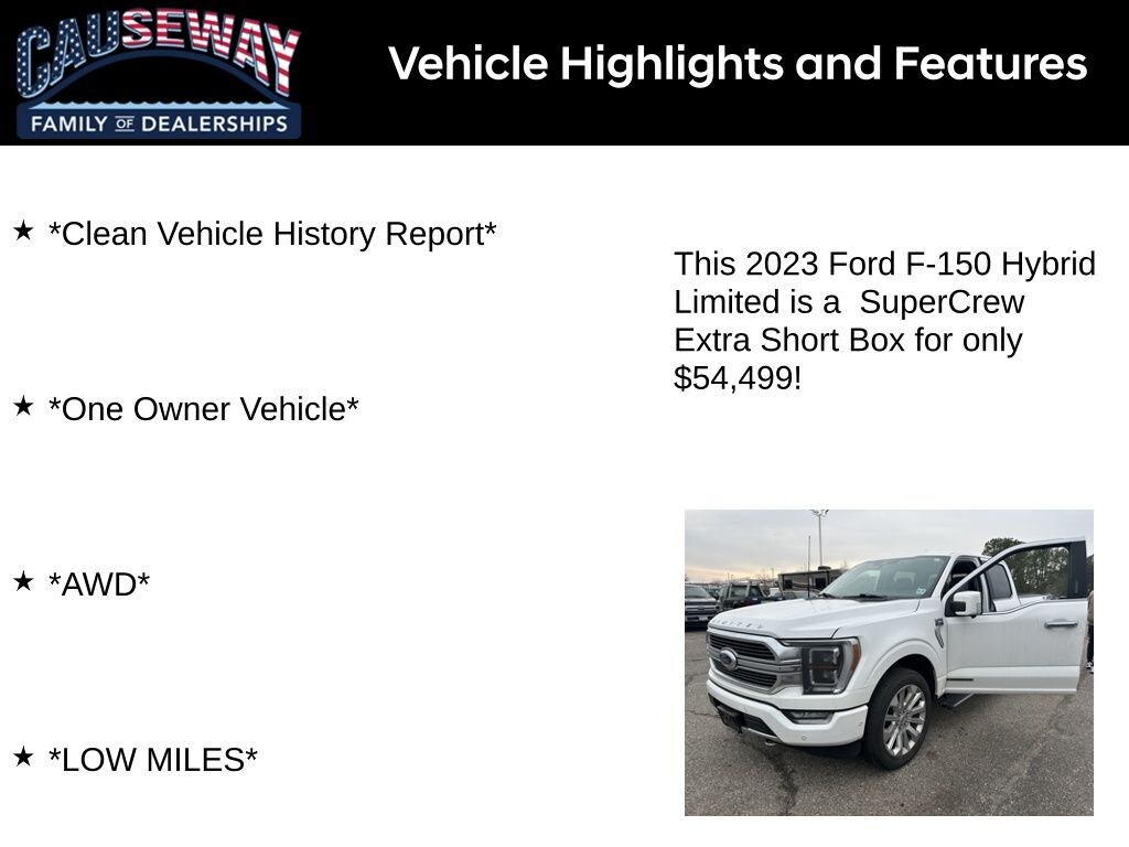 2023 Ford F-150 Limited White Metallic 4WD 10-Speed Automatic 3.5L PowerBoost Full-Hybrid V6 *Clean Vehicle History Report*, *One Owner Vehicle*, *AWD*, *LOW MILES*, 3.5L PowerBoost Full-Hybrid V6, 4WD.