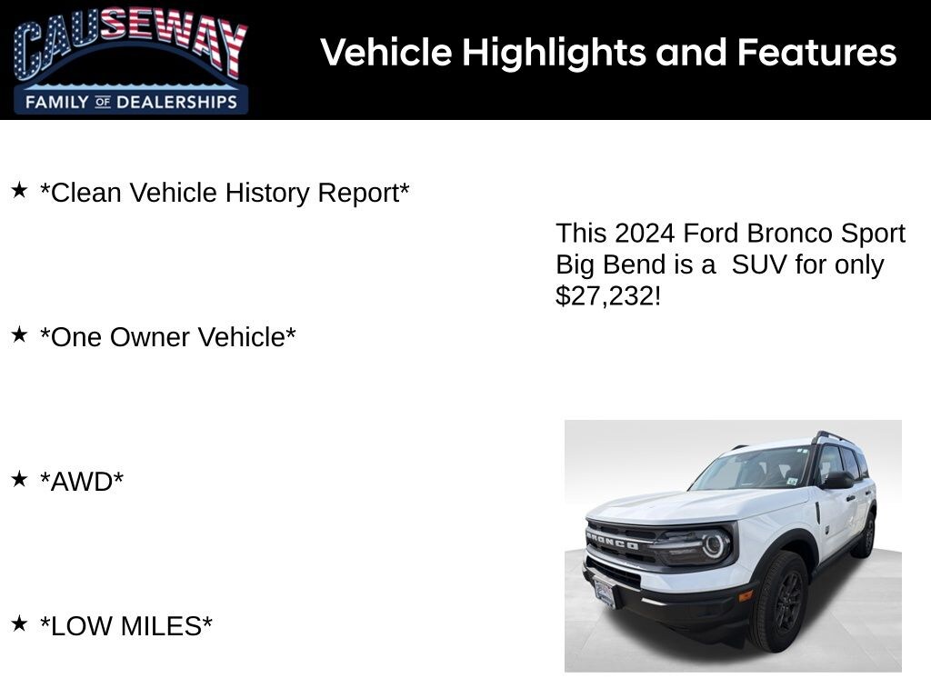 2024 Ford Bronco Sport Big Bend Oxford White 4WD 8-Speed Automatic 1.5L EcoBoost *Clean Vehicle History Report*, *One Owner Vehicle*, *AWD*, *LOW MILES*.