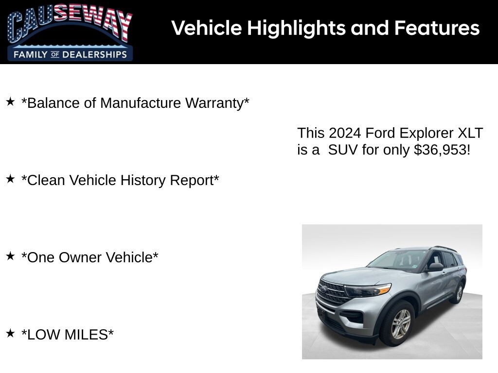 This 2024 Ford Explorer XLT offers a perfect balance of performance, technology, and style. With its low miles, one-owner history, and AWD capability, its ready for both daily commutes and weekend adventures, giving you confidence and comfort every mile of the way.