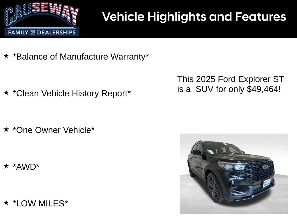2025 Ford Explorer ST Black Metallic 4WD 10-Speed Automatic 3.0L EcoBoost V6 *Balance of Manufacture Warranty*, *Clean Vehicle History Report*, *One Owner Vehicle*, *AWD*, *LOW MILES*, 4WD.