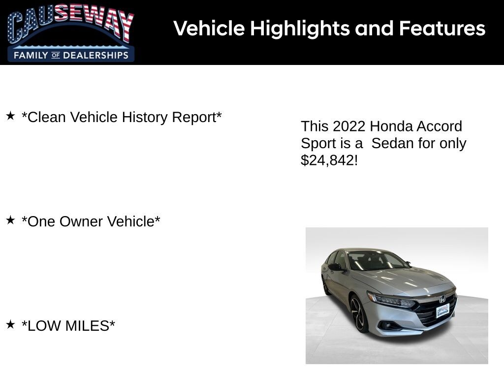 Sleek, efficient, and unmistakably Sport, this 2022 Accord delivers the style you want and the dependability you needat a value that makes sense.