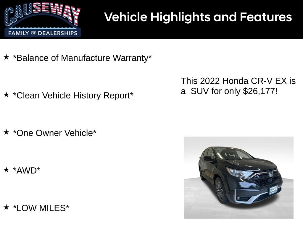 2022 Honda CR-V EX AWD CVT 1.5L I4 DOHC 16V *Balance of Manufacture Warranty*, *Clean Vehicle History Report*, *One Owner Vehicle*, *AWD*, *LOW MILES*, AWD.