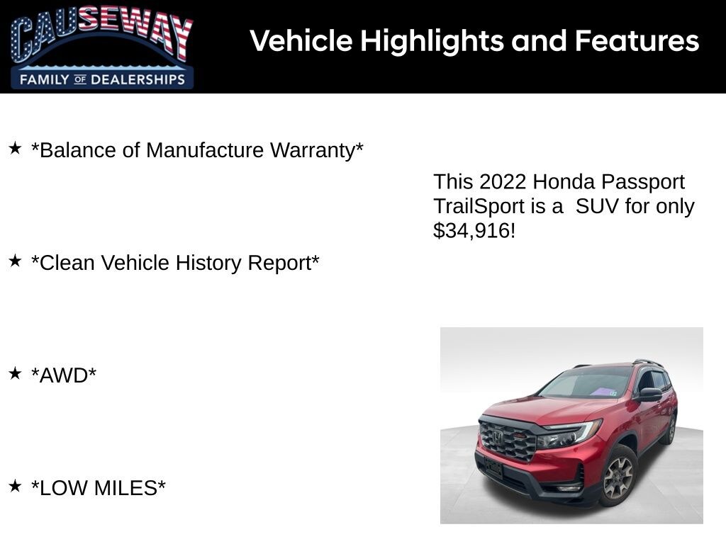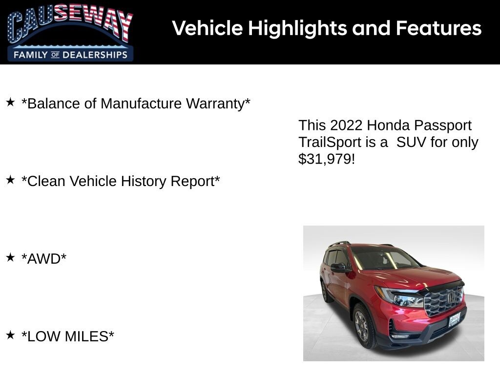 Turn every drive into an adventure with this Radiant Red Metallic II 2022 Honda Passport TrailSport AWD. Ruggedly built and luxuriously equipped, this one-owner SUV comes with a Clean Vehicle History Report, LOW MILES, and the Balance of Manufacture Warranty for added peace of mind.