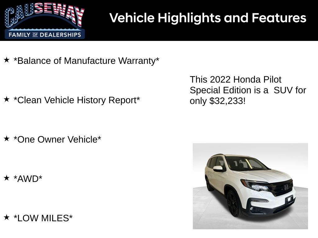Elevate your driving experience with the 2022 Honda Pilot Special Edition in stunning Platinum White Pearl. Combining sleek style, advanced technology, and Hondas legendary reliability, this one-owner, low-mileage, AWD SUV is perfect for families, adventure seekers, and anyone who demands comfort and capability in one sophisticated package.