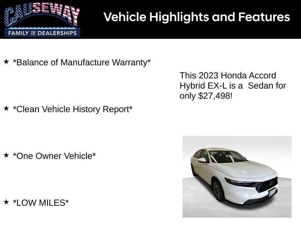 2023 Honda Accord Hybrid EX-L White FWD eCVT 2.0L 16V DOHC *Balance of Manufacture Warranty*, *Clean Vehicle History Report*, *One Owner Vehicle*, *LOW MILES*, 2.0L 16V DOHC.