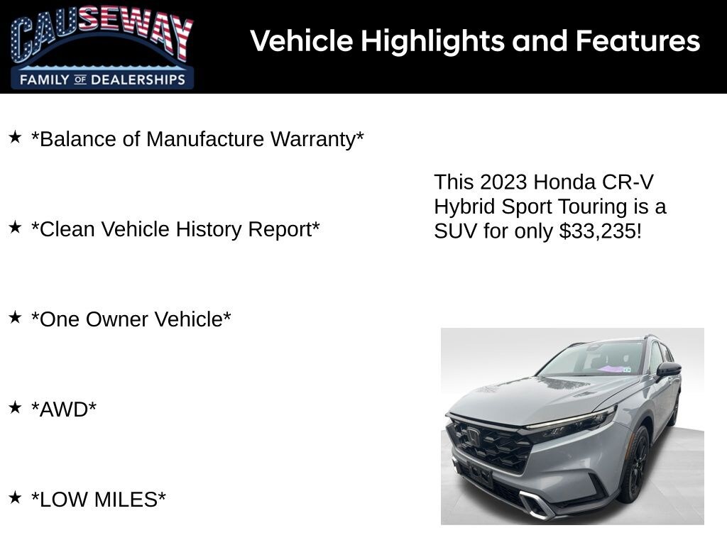 2023 Honda CR-V Hybrid Sport Touring AWD eCVT 2.0L I4 DOHC 16V *Balance of Manufacture Warranty*, *Clean Vehicle History Report*, *One Owner Vehicle*, *AWD*, *LOW MILES*, 2.0L I4 DOHC 16V.