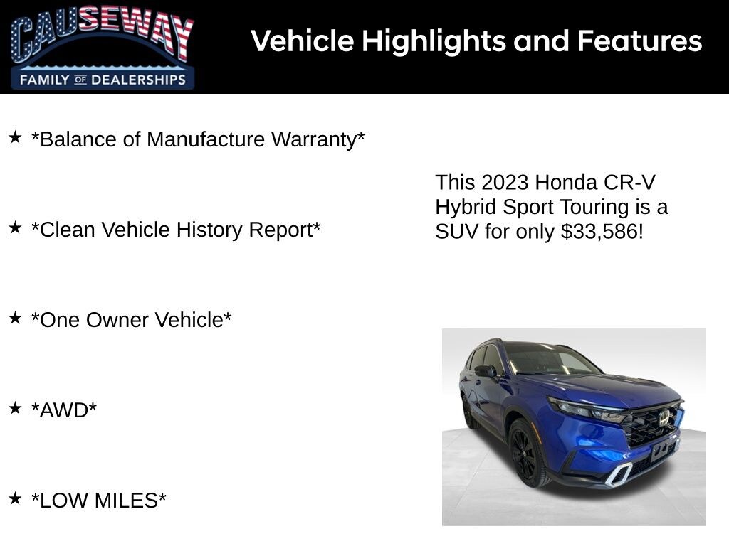 2023 Honda CR-V Hybrid Sport Touring Canyon River Blue Metallic AWD eCVT 2.0L I4 DOHC 16V *Balance of Manufacture Warranty*, *Clean Vehicle History Report*, *One Owner Vehicle*, *AWD*, *LOW MILES*, 2.0L I4 DOHC 16V.