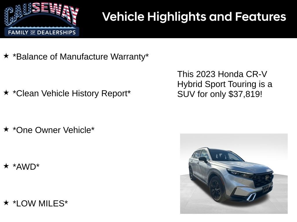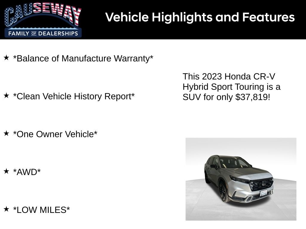 Step into the future of driving with the 2023 Honda CR-V Hybrid Sport Touring AWD, a premium SUV designed for those who demand efficiency without sacrificing performance, style, or comfort. With only 7,499 milesa full 22,657 miles below market averagethis CR-V Hybrid offers you the rare chance to own a near-new, top-tier model backed by Hondas legendary reputation for reliability.