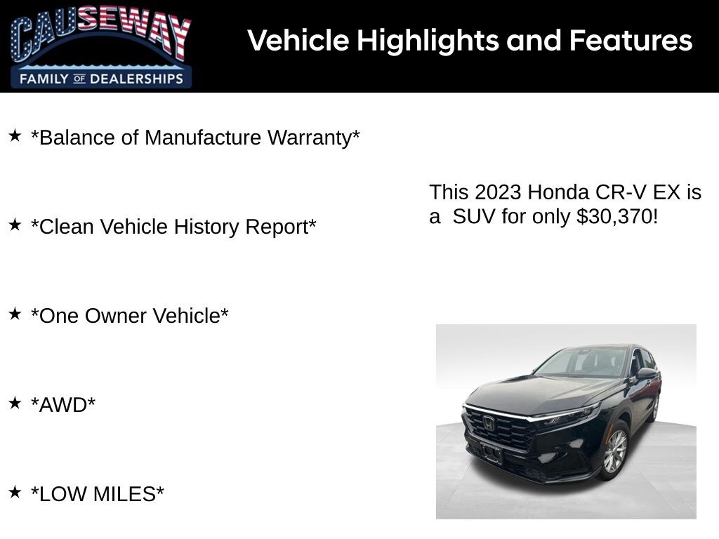 Drive with confidence in this Crystal Black Pearl 2023 Honda CR-V EX AWD, a one-owner SUV with a clean vehicle history report, low miles, and the backing of the balance of the manufacturers warranty. The CR-V is Hondas most popular SUV for a reasonoffering the perfect blend of everyday comfort, advanced safety, and versatile capability.