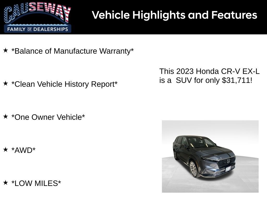 Experience everyday sophistication with this 2023 Honda CR-V EX-L AWD, finished in stunning Sparkle Silver Metallic and equipped with luxurious leather seating and advanced technology. This one-owner SUV boasts a clean vehicle history report, low mileage, and the balance of Hondas manufacturer warranty, delivering exceptional value and peace of mind.