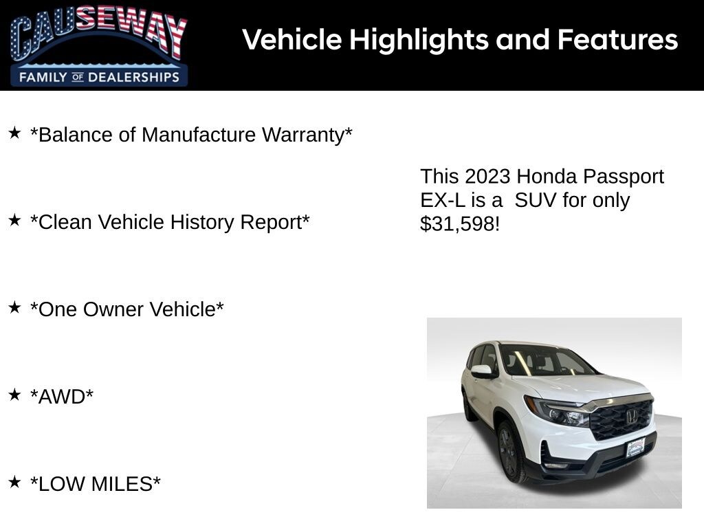 2023 Honda Passport EX-L Platinum White Pearl AWD 9-Speed Automatic 3.5L V6 24V SOHC i-VTEC *Balance of Manufacture Warranty*, *Clean Vehicle History Report*, *One Owner Vehicle*, *AWD*, *LOW MILES*.