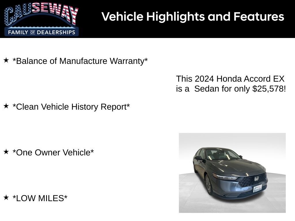Elevate your driving experience with the 2024 Honda Accord EX in striking Meteorite Gray Metallic. This One Owner, Low Mileage sedan comes with a Balance of Manufacturer Warranty and a Clean Vehicle History Report, offering unmatched confidence and peace of mind.