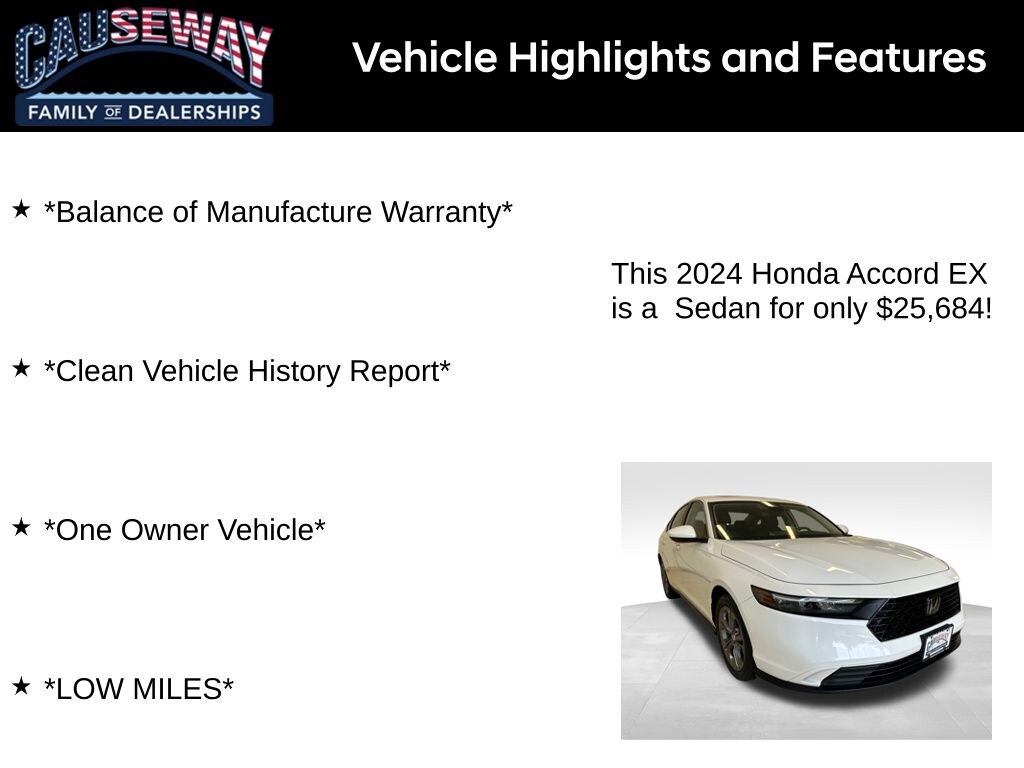2024 Honda Accord EX FWD CVT 1.5T I4 DOHC 16V Turbocharged VTEC *Balance of Manufacture Warranty*, *Clean Vehicle History Report*, *One Owner Vehicle*, *LOW MILES*, Cloth.