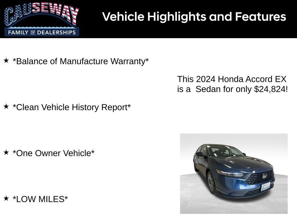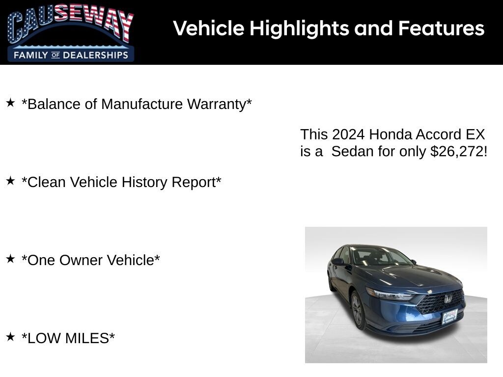 Experience Hondas award-winning blend of style, efficiency, and advanced technology with this stunning 2024 Honda Accord EX, finished in the eye-catching Canyon River Blue Metallic. With LOW MILES, a Clean Vehicle History Report, and full Balance of Manufacture Warranty, this Accord delivers exceptional long-term confidence and value.