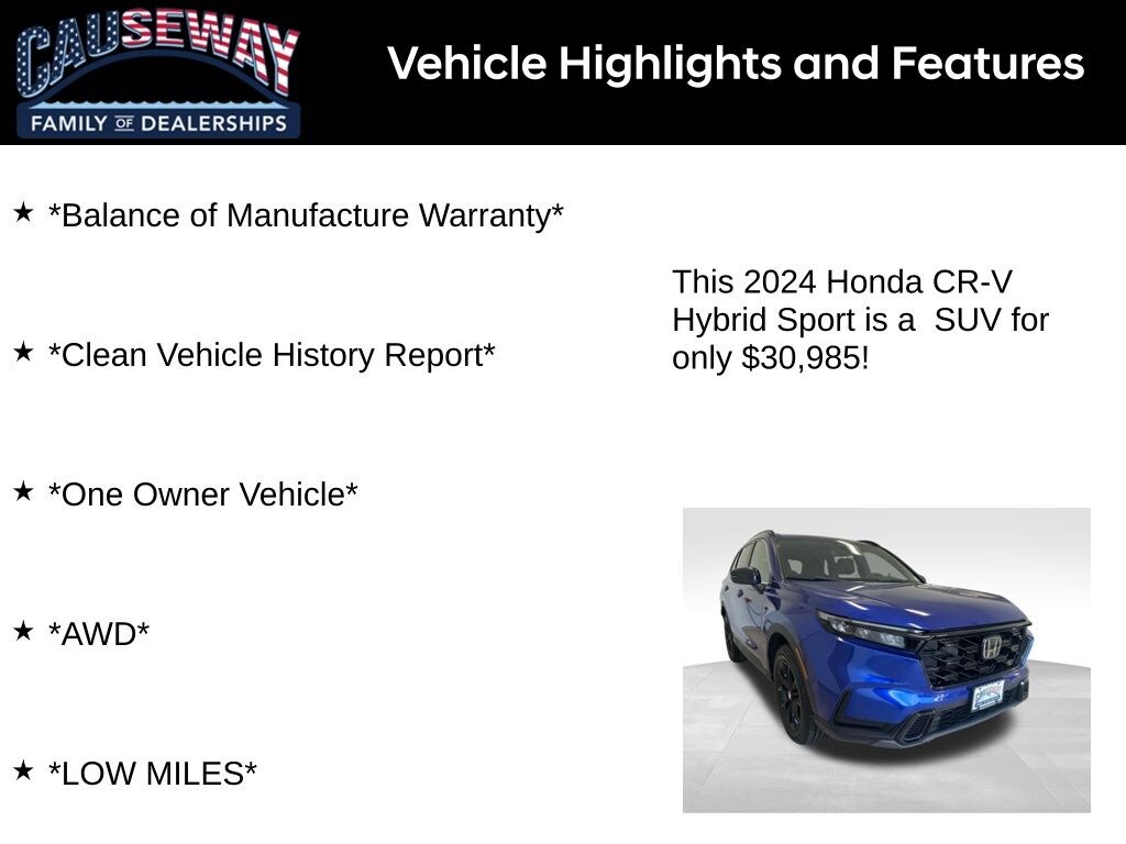 2024 Honda CR-V Hybrid Sport Canyon River Blue Metallic AWD eCVT 2.0L I4 DOHC 16V *Balance of Manufacture Warranty*, *Clean Vehicle History Report*, *One Owner Vehicle*, *AWD*, *LOW MILES*, 2.0L I4 DOHC 16V.