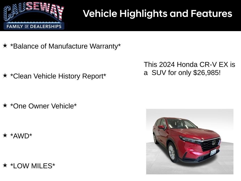 2024 Honda CR-V EX AWD Sparkle Silver Metallic ⢠One-Owner ⢠Balance of Factory Warranty