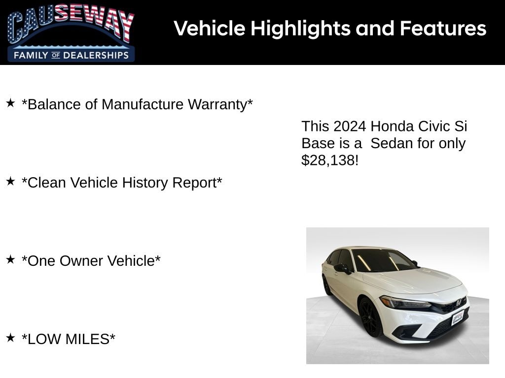 This 2024 Honda Civic Si Base is built for drivers who crave performance without compromising on technology and safety. With its low miles, one-owner history, and sporty design, its ready to deliver excitement, confidence, and efficiency every time you get behind the wheel.