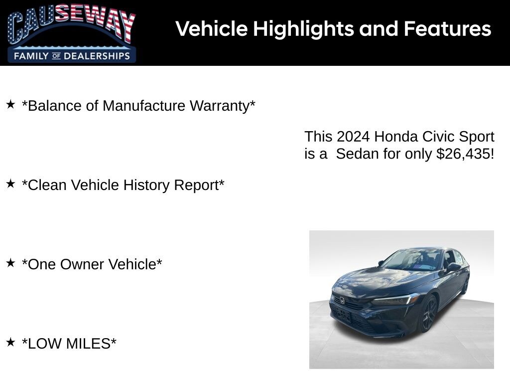 Drive with confidence and sophistication in the 2024 Honda Civic Sport, a sedan that perfectly balances athletic styling, advanced technology, and everyday practicality. Finished in a bold Crystal Black Pearl exterior and paired with a sleek black artificial leather interior, this Civic Sport stands out with its modern design and refined details.